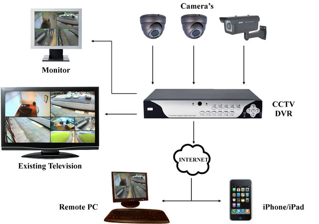 DVR (Digital Video Recorder) is used to record the video captured by cameras. Normally cameras are connected to DVR and the output of DVR is connected to a monitor. The monitor may be CRT,LCD, or Flat screen of television or computer monitor.